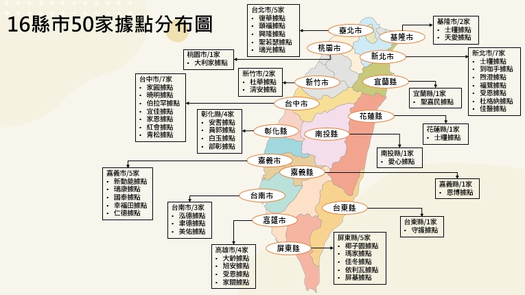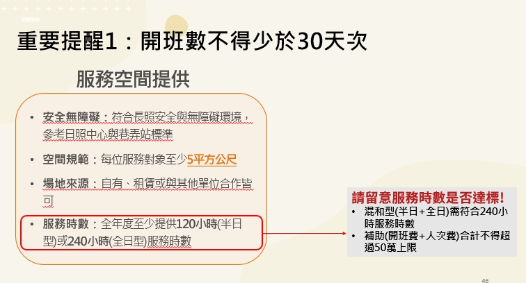 陳景寧秘書長先介紹家總輔導團北中南三區的窗口胡哲瑋、陸勁宇、劉柏寅社工,再介紹七位輔導顧問,包括國北護陳正芬教授、老盟張淑卿秘書長、亞洲大學吳肖琪教授、南華大學魏書娥教授、國北商韓幸紋教授、士糧李梅英副執行長、伊甸何天元執行長;並介紹五十個據點名稱及在臺灣的分布。接著景寧秘書長介紹計畫的時程,以及據點註冊、據點開通後的資格審查、媒合與統計;照服員及使用者(照顧者)的註冊、照服員的線上訓練、照顧者的體驗及參與實習等事項,最後是營運注意事項的提醒,例如開班一年最低30天次、三期的最低人數、照服員及值班照顧者和被照顧者的人力比、原日照成員不得超過50%、超過32小時值班將鎖卡、宣傳品規定互助喘息logo及衛福部長照服務發展基金補助字樣。