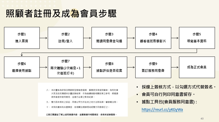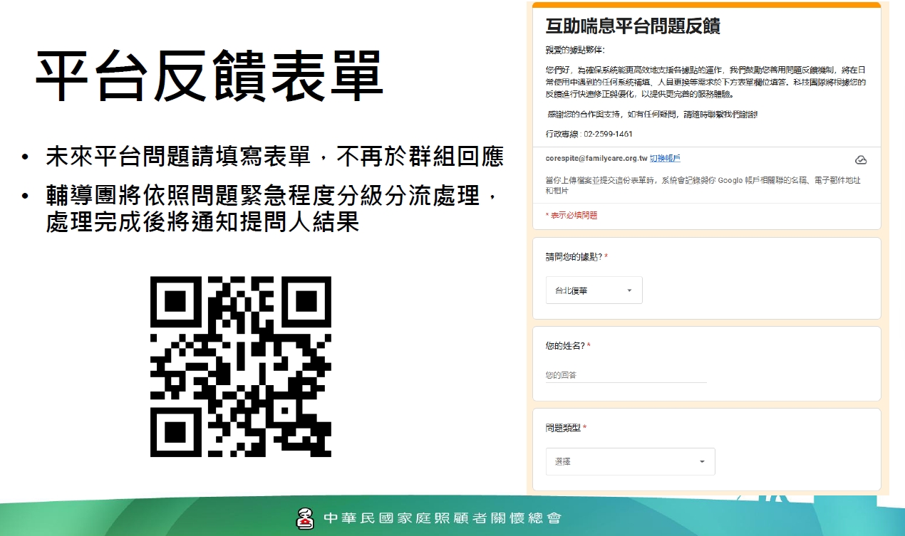 經過了半個多月的平台移轉及新據點成員加入,有鑑於50個據點承辦人員在平台使用上還是有很多疑問。因應新平台於2月1日開始上線試用,家總輔導團安排2月9日線上說明會向據點說明照顧者及照服員相關操作流程與系統介面,並開放據點夥伴進行提問。長照司承辦人員張芳瑜也參與在線上。陳正芬教授與負責科技平台的洪論評教授及科技團隊亦一起進行瞭解系統使用的困難、說明與問題解答,期待據點在使用互喘平台上,能夠更加了解研究需求及順暢。