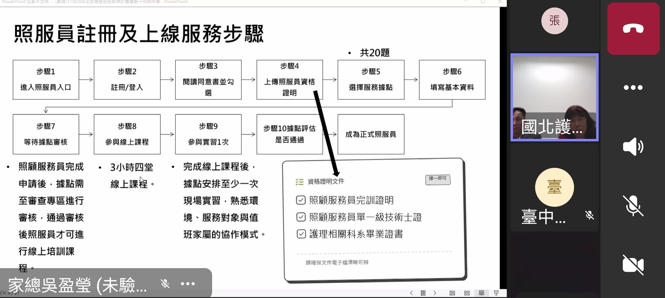 家總在1月13日舉行線上據點啟動說明會,邀請遴選上的50個據點參加,會議由衛福部長照司白姍綺簡任技正及家總秘書長陳景寧主持,陳正芬教授同時也是國北護計畫總主持人,表達對50個據點參與的感謝,每個據點平均有兩人上線參與。